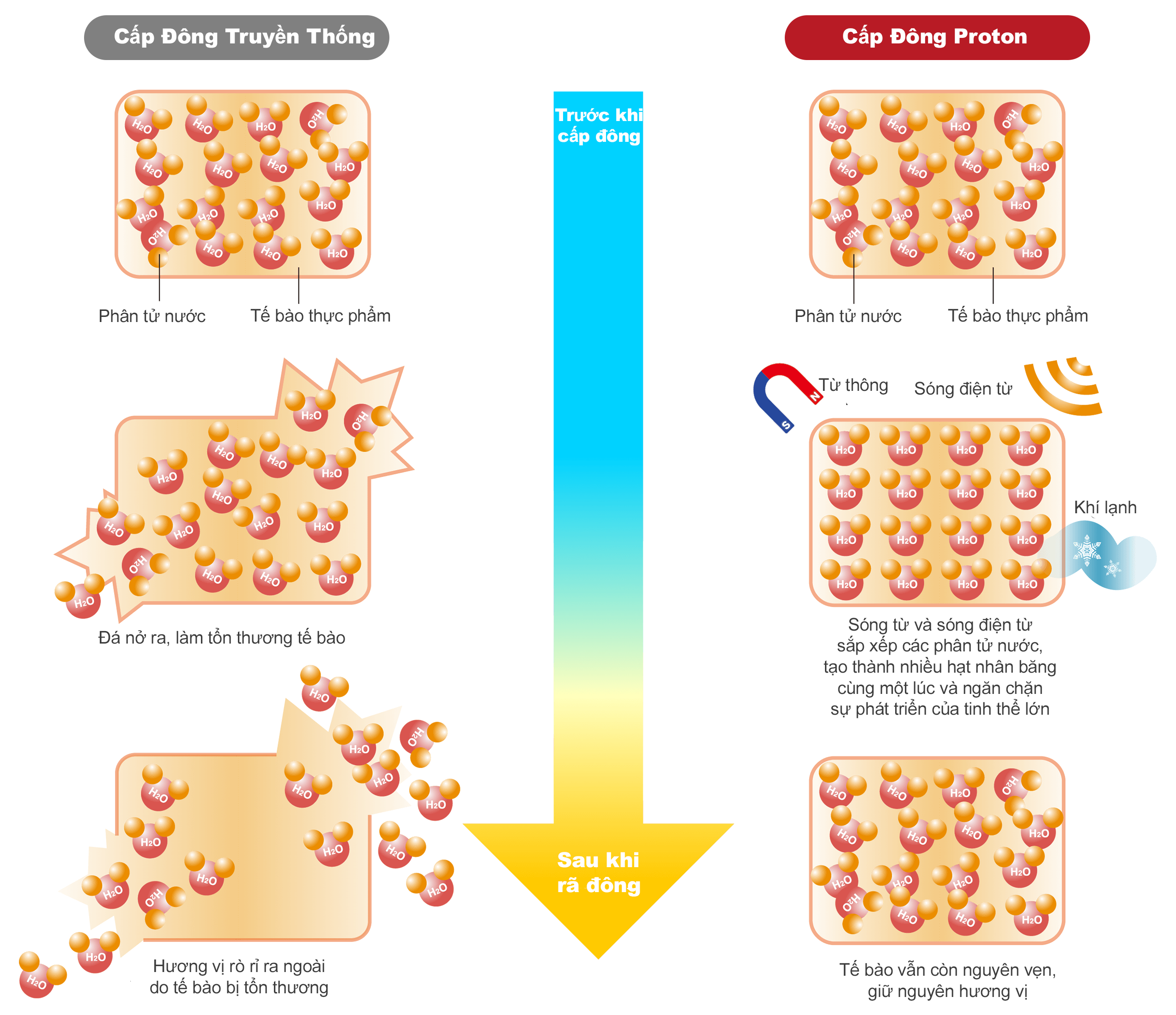 Các phương pháp đông lạnh truyền thống thường làm hỏng thực phẩm bằng cách giãn nở các phân tử nước, làm vỡ tế bào. Đông lạnh bằng proton sử dụng sóng từ và sóng điện từ để sắp xếp các phân tử nước, sau đó đông lạnh chúng nhanh chóng, giữ nguyên hương vị và kết cấu của thực phẩm.